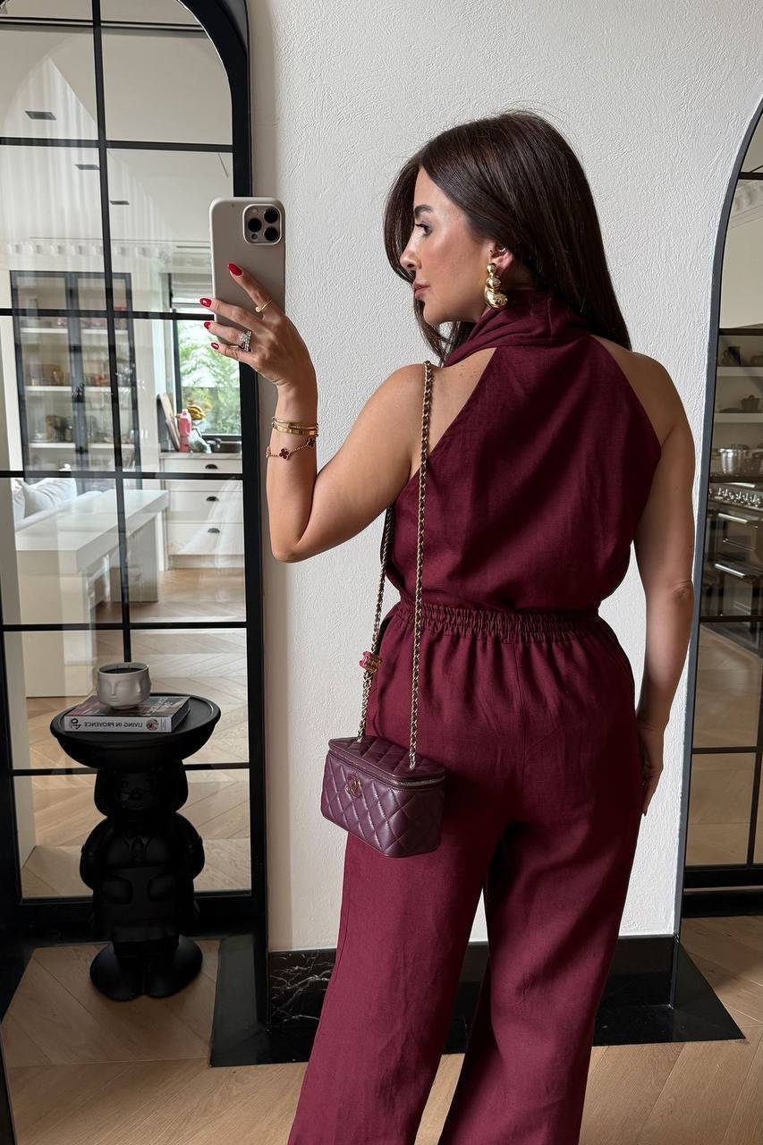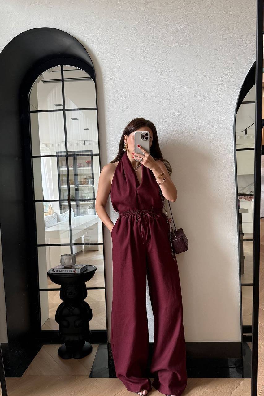 تألقي بإطلالة راقية مع هذا الجمبسوت الفاخر بلونه النبيذي الجذاب. يتميز بتصميم رقبة ملتفة يكشف الأكتاف ويمنحكِ مظهرًا أنثويًا وأنيقًا، مع خصر مزموم برباط ليبرز جمال القوام بطريقة مريحة وناعمة.